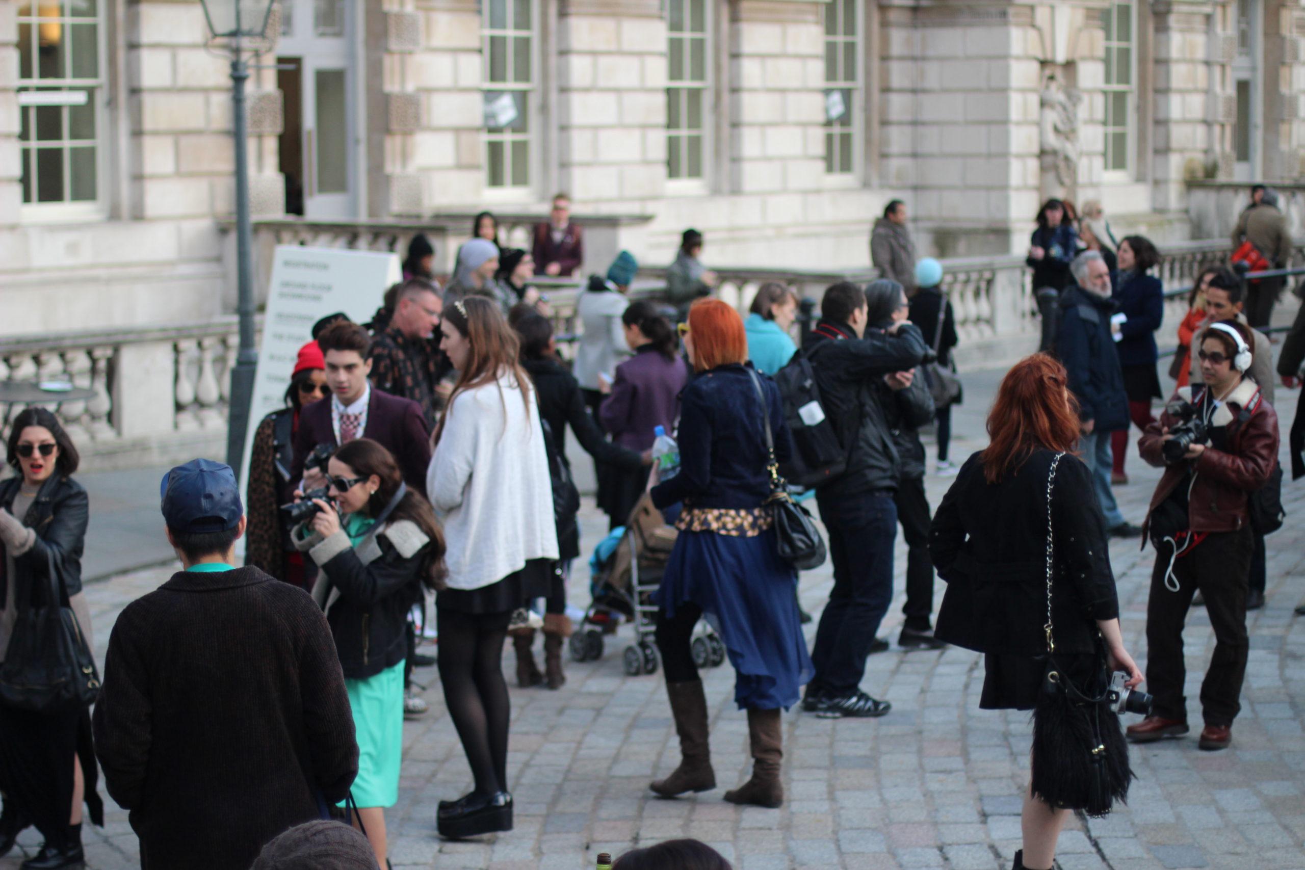 LFW is based at Somerset House just around the corner from where I work. I popped along to see what all the fuss was about and it was really quite entertaining. The runway shows and the FROW (front row doncha know) is where all the action is. But there is a whole other drama happening in the court yard of Somerset House that anyone can go along and watch. Apparently this spectacle has caused a bit of a ruckus and some reflection on the nature of blogging which is interesting. I did find it fascinating that Bloggers had their own marked reception desk alongside Press, Buyers and Visitors (clearly an influential group).